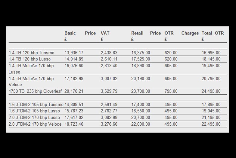 The range comprises of three petrol and two diesel powerplants, all turbocharged. The petrol lineup includes a 1.4-liter TB with 120 bhp, a 1.4-liter TB MultiAir producing 170bhp and a top-of-the-range 1750 TBi with 235bhp for the Cloverleaf model that boasts a top speed of 150 mph and a 0–62 mph (100km/h) acceleration time of 6.8 secondsOn the diesel side there's a 1.6 JTDM-2 with 105bhp and a 2.0 JTDM-2 delivering 170bhp.